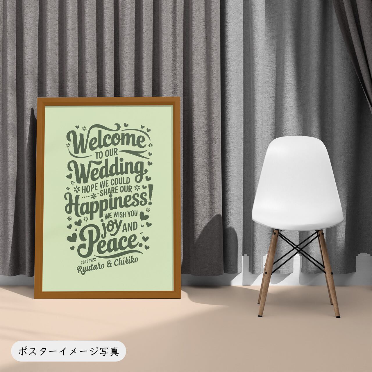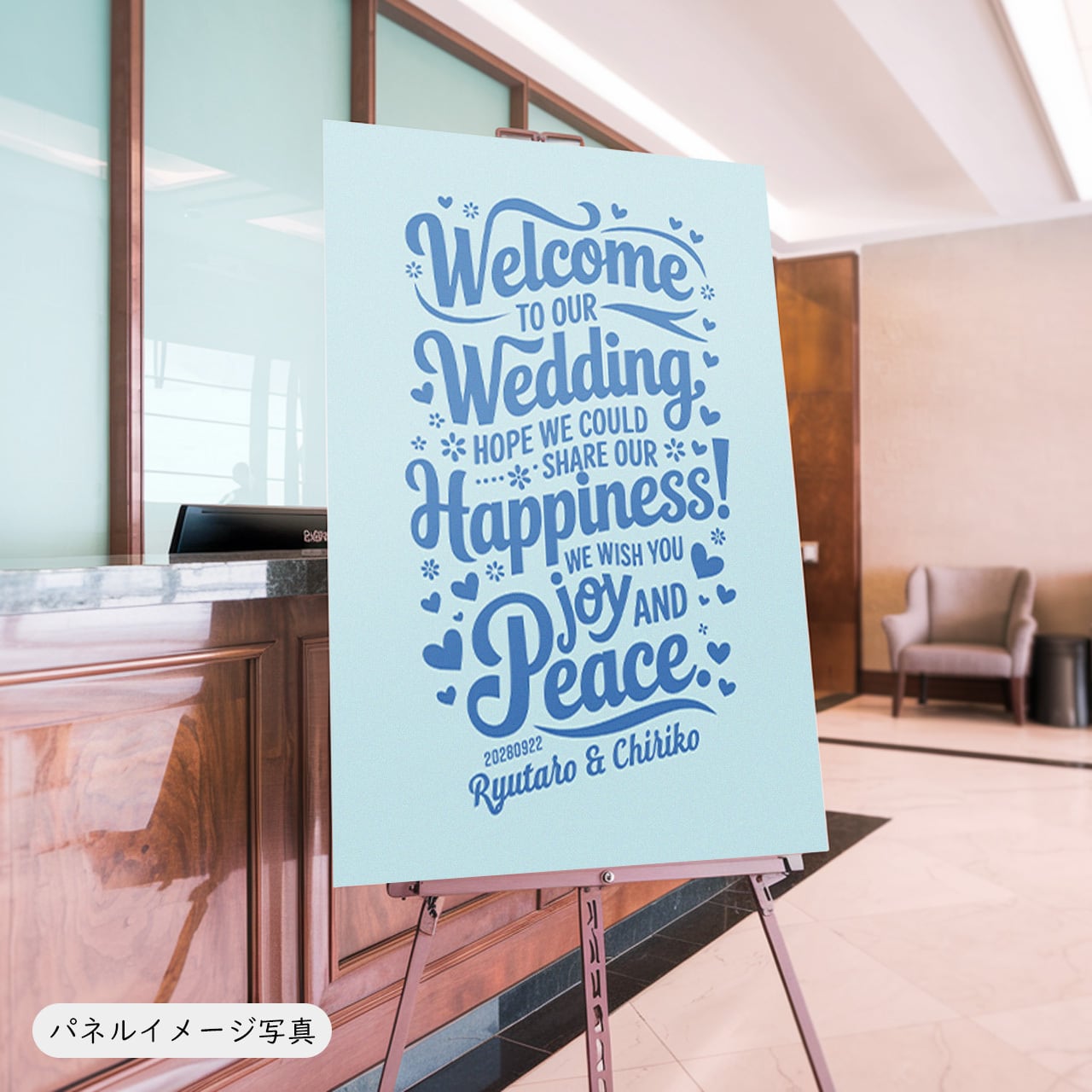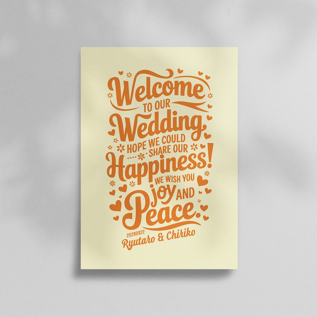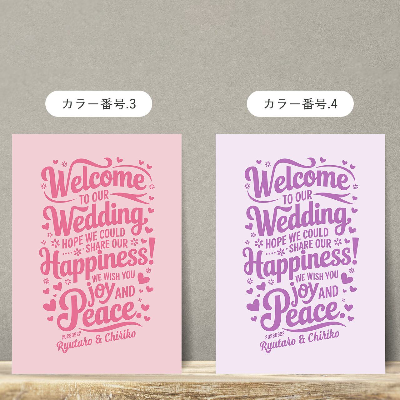 タイポグラフィ・メッセージ系のウェルカムボード。記念日などの日付とお二人のお名前をいれることができます。
