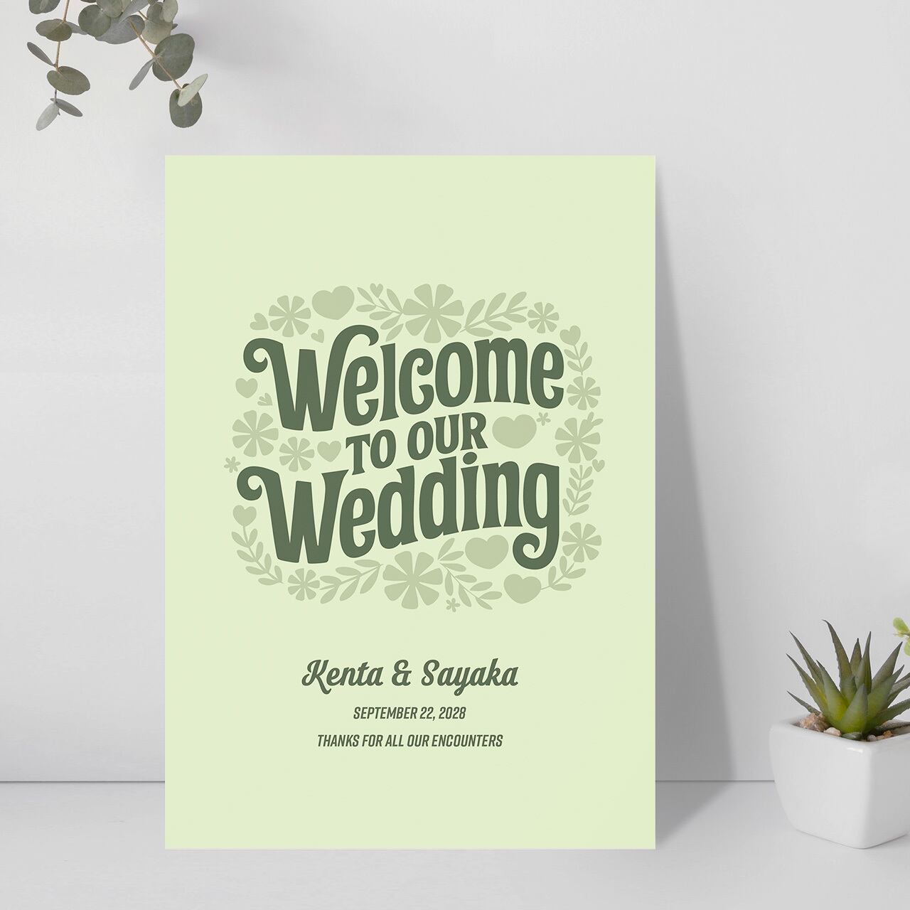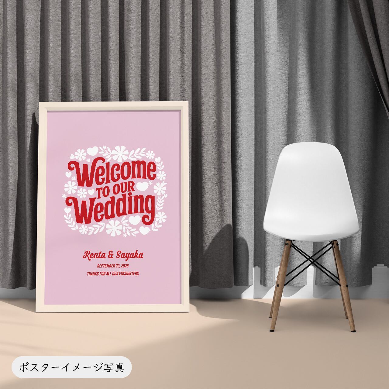タイポグラフィ・メッセージ系のウェルカムボード。記念日などの日付とお二人のお名前をいれることができます。