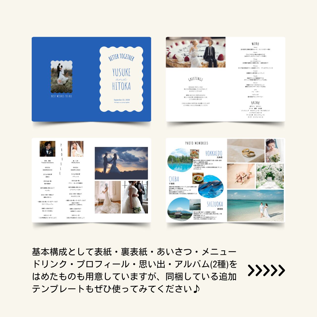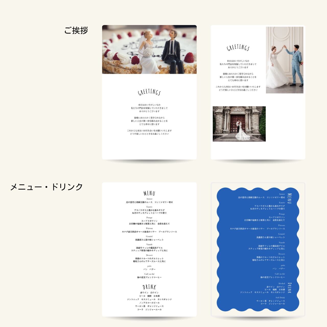 基本構成として、表紙・ご挨拶・メニュー/ドリンク・プロフィール・思い出の場所・アルバム2種・裏表紙を配置していますが、この他にもいろいろ用意しています。