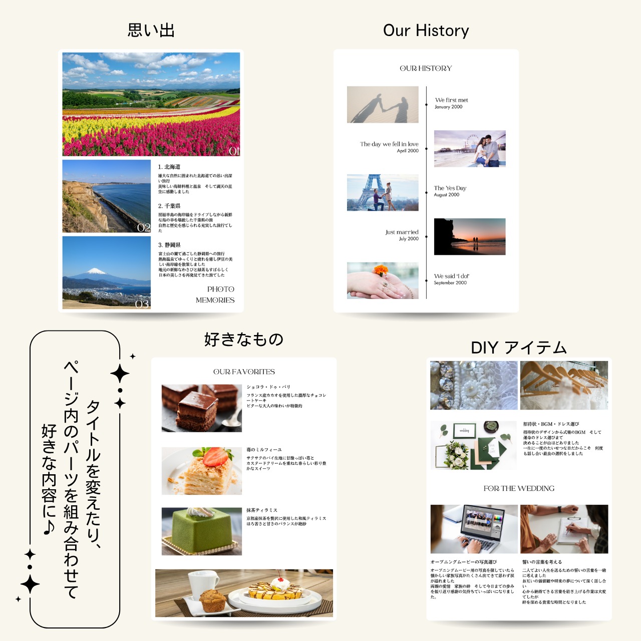 基本構成として、表紙・ご挨拶・メニュー/ドリンク・プロフィール・思い出の場所・アルバム2種・裏表紙を配置していますが、この他にもいろいろ用意しています。