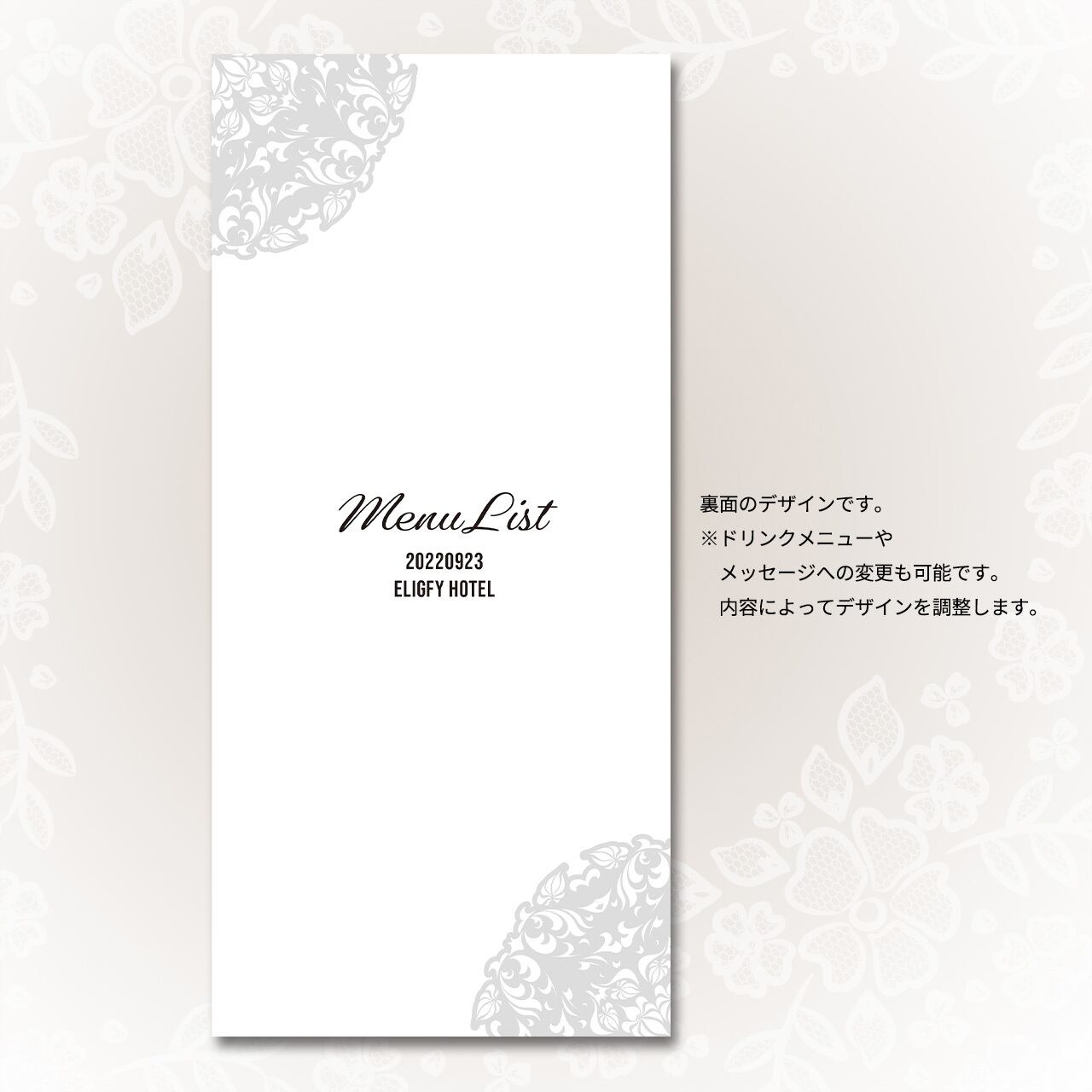無料にて裏面への印刷も可能です。裏面にドリンクメニューやメッセージの記載などご希望があればお聞かせください。