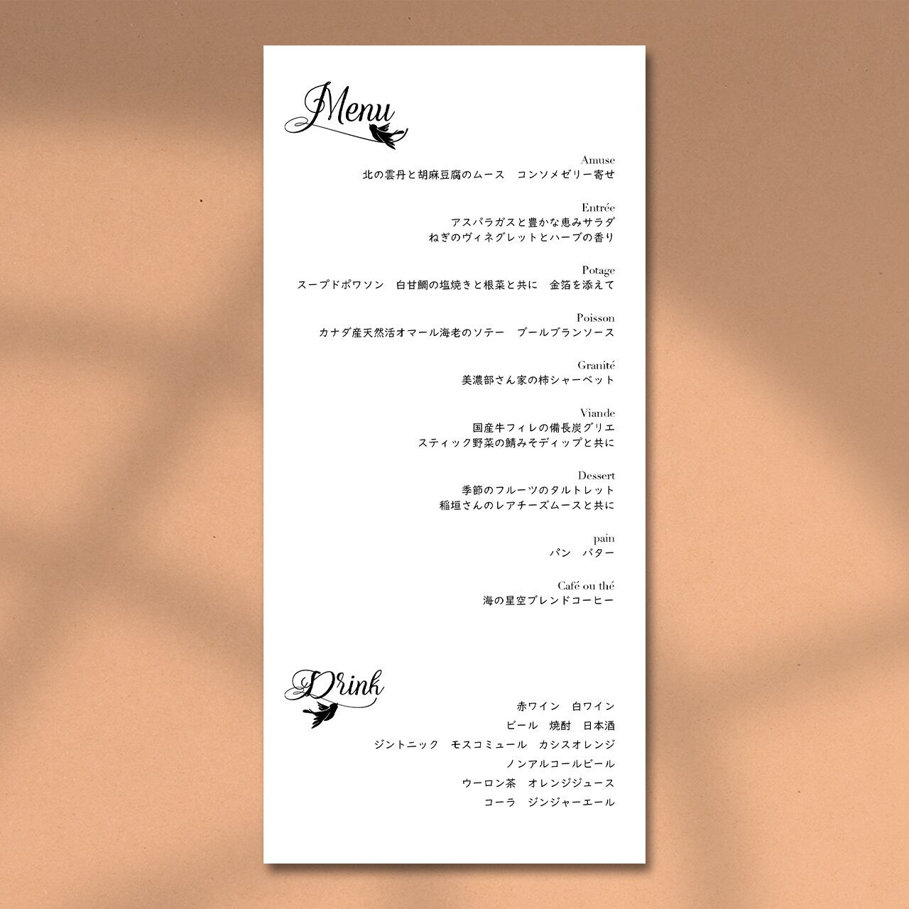 無料にて裏面への印刷も可能です。裏面にドリンクメニューやメッセージの記載などご希望があればお聞かせください。