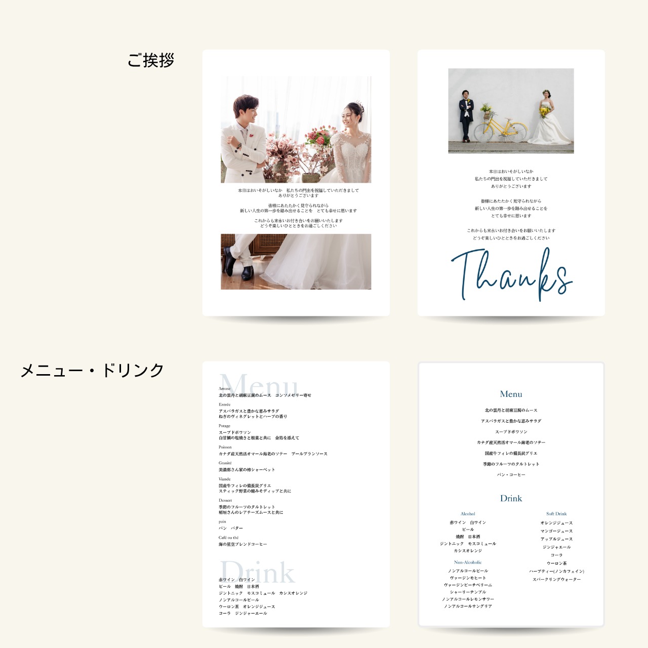 基本構成として、表紙・ご挨拶・メニュー/ドリンク・プロフィール・思い出の場所・アルバム2種・裏表紙を配置していますが、この他にもいろいろ用意しています。