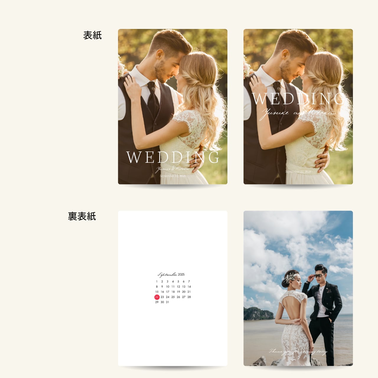 基本構成として、表紙・ご挨拶・メニュー/ドリンク・プロフィール・思い出の場所・アルバム2種・裏表紙を配置していますが、この他にもいろいろ用意しています。