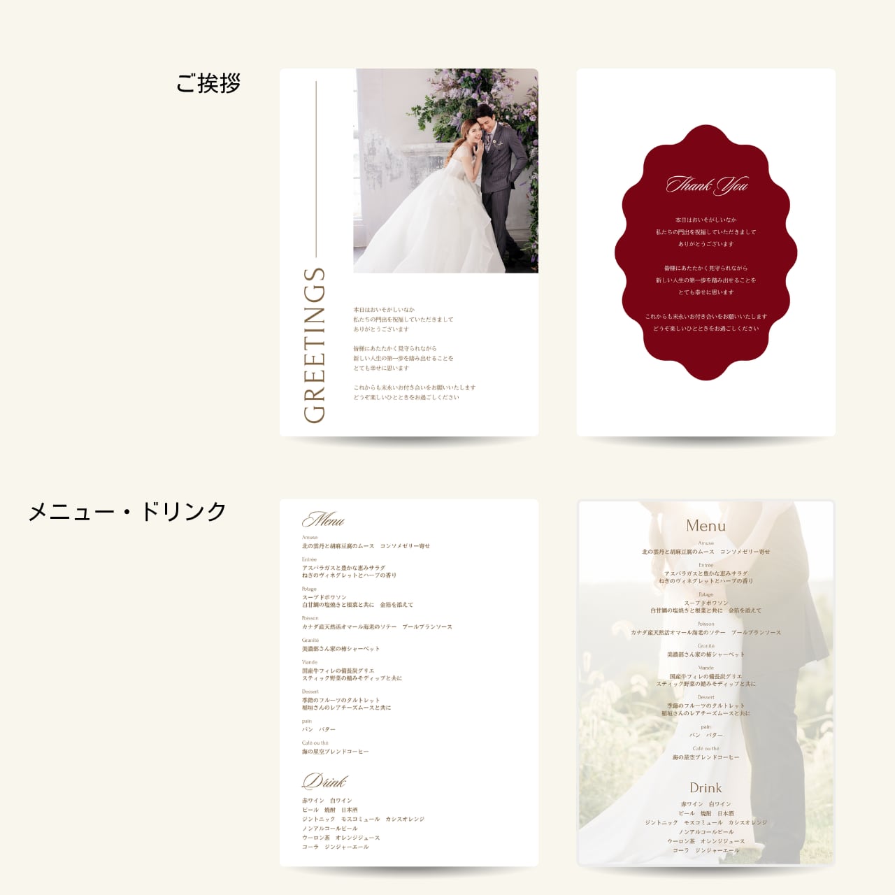 基本構成として、表紙・ご挨拶・メニュー/ドリンク・プロフィール・思い出の場所・アルバム2種・裏表紙を配置していますが、この他にもいろいろ用意しています。