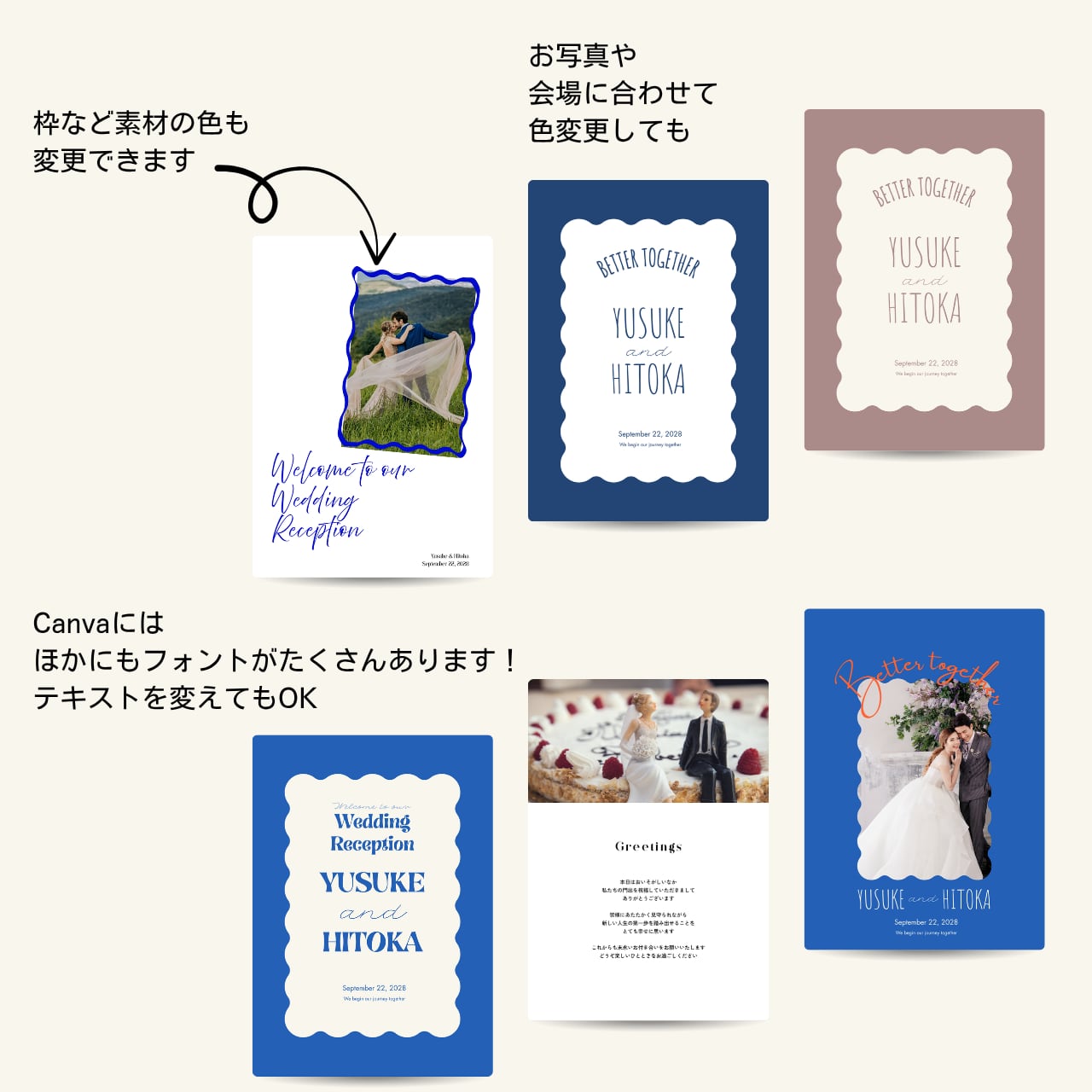 構成(内容)を変えるだけではなく、フォントや色、文字の大きさ等すべてCanvaで編集可能ですので、自由に変更してオリジナリティあふれるアイテムを作ってください。
